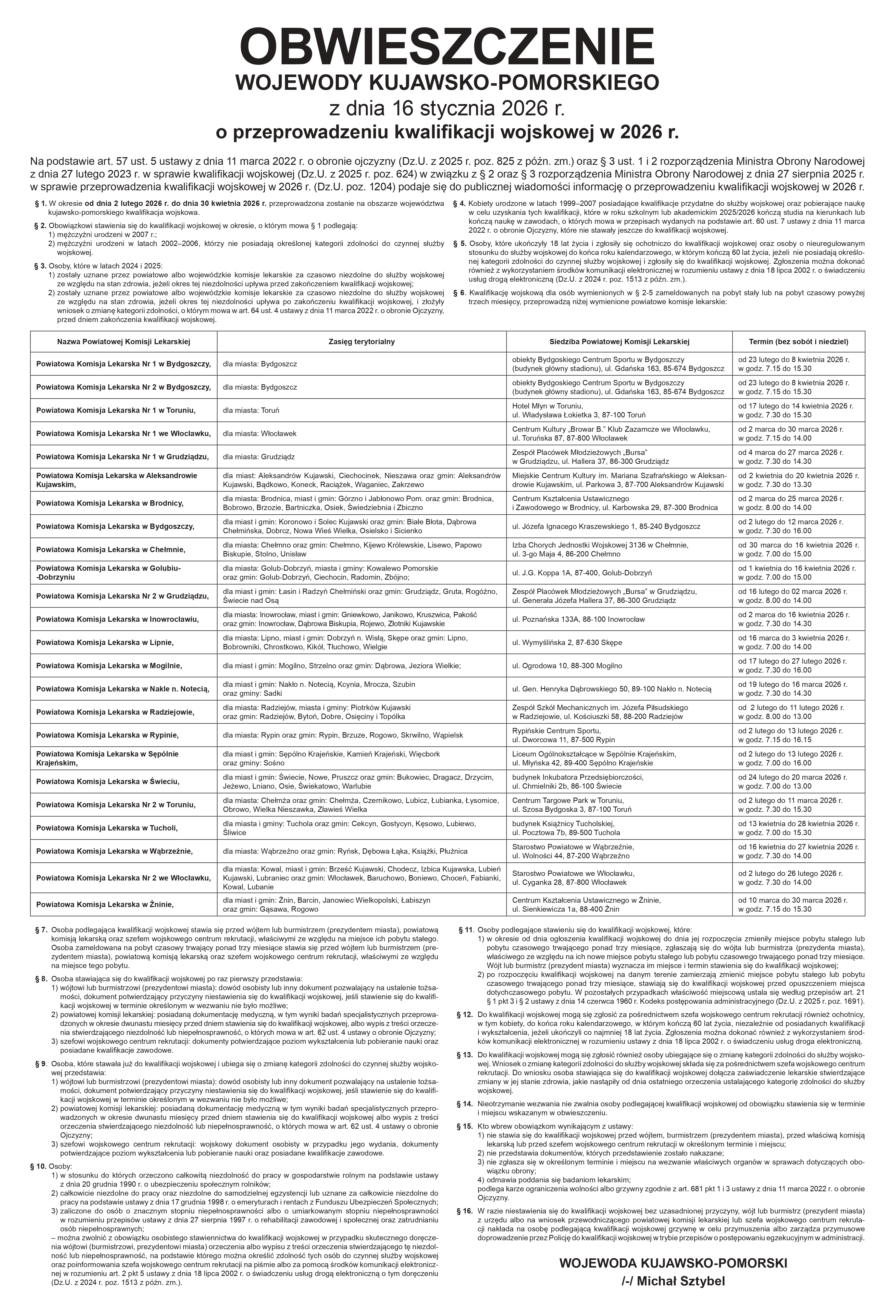 OBWIESZCZENIE WOJEWODY KUJAWSKO-POMORSKIEGO z dnia 16 stycznia 2026 r. o przeprowadzeniu kwalifikacji wojskowej w 2026 r. [TREŚĆ PDF]