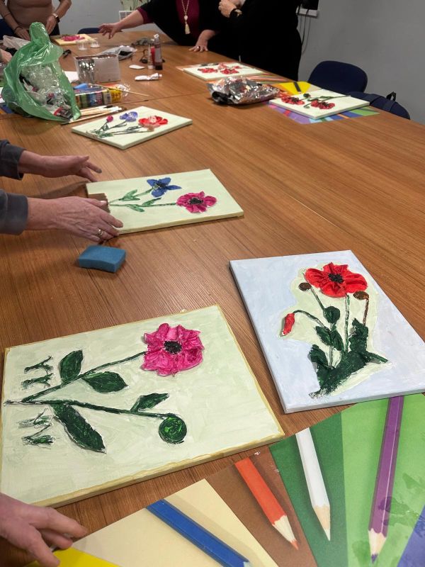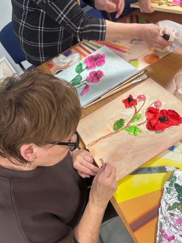 W Klubie Seniora w Wielkim Wełczu odbyły się wyjątkowe warsztaty florystyczne, podczas których uczestnicy wykonywali maki na płótnie.